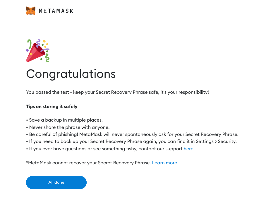β οΈ Remember step 5! β οΈ Do not copy/paste the phrase. Do not take a photo of it. Only write it onto a slip of paper and ensure to keep it in a safe place.