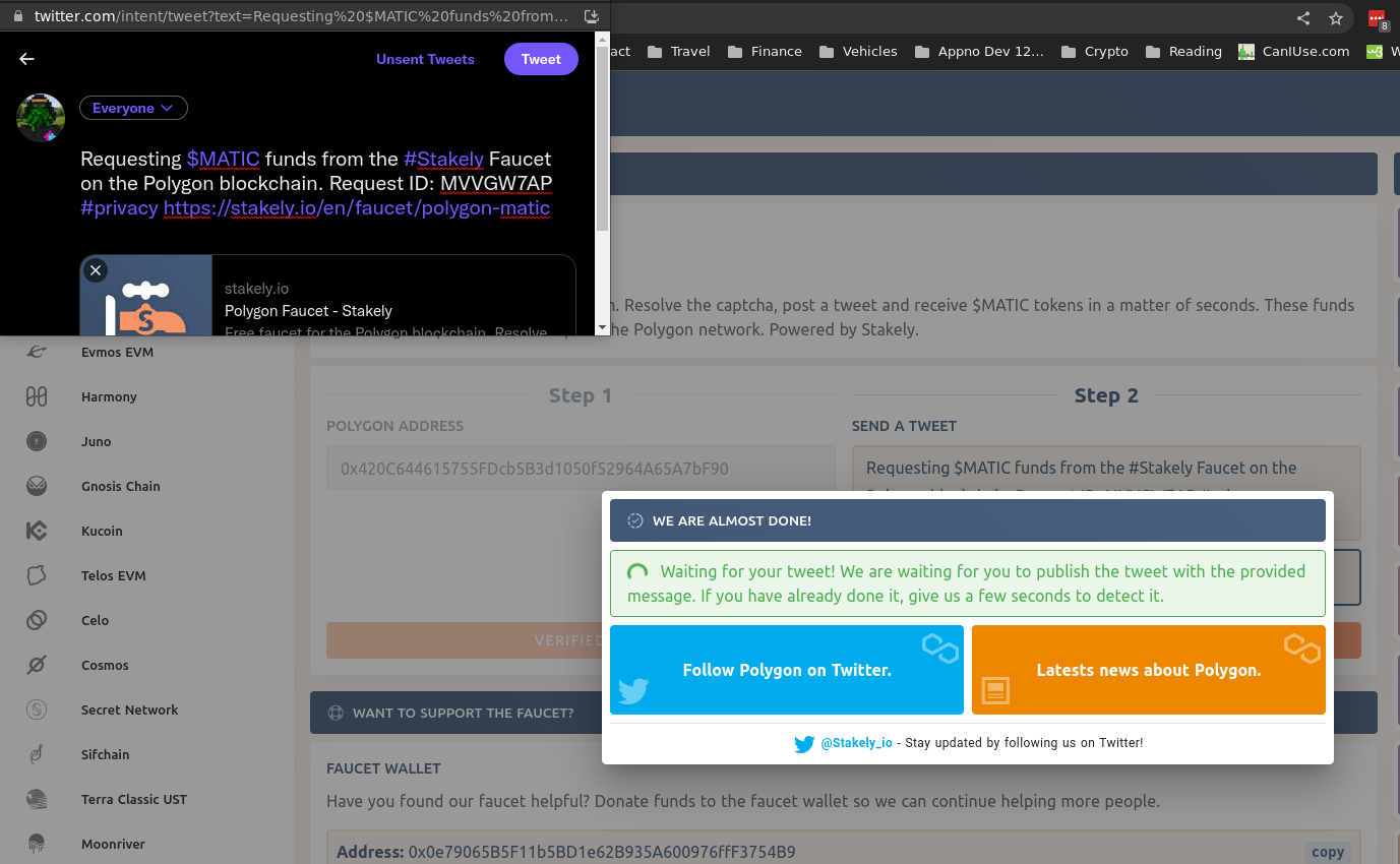 Once you've made your tweet, the faucet verifies your tweet and in a few moments, check your MetaMask account and you'll see your MATIC balance update.